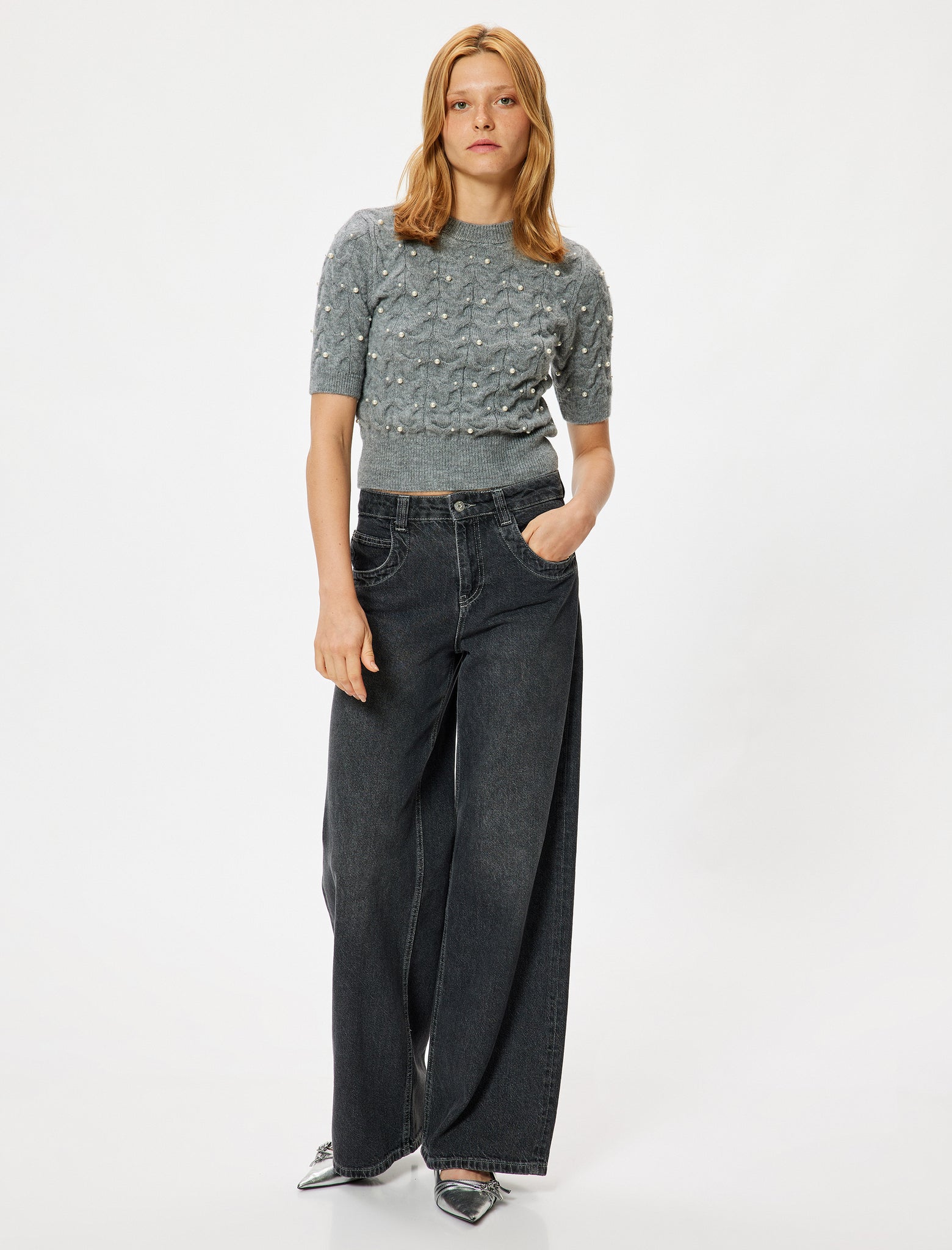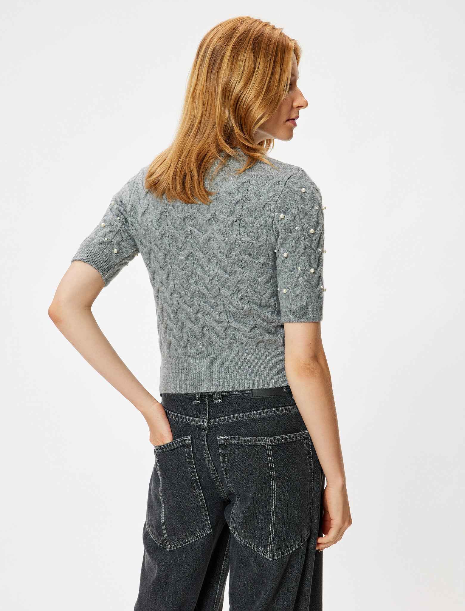 Pearl embroidered crew neck short sleeve soft touch cable-knit sweater.