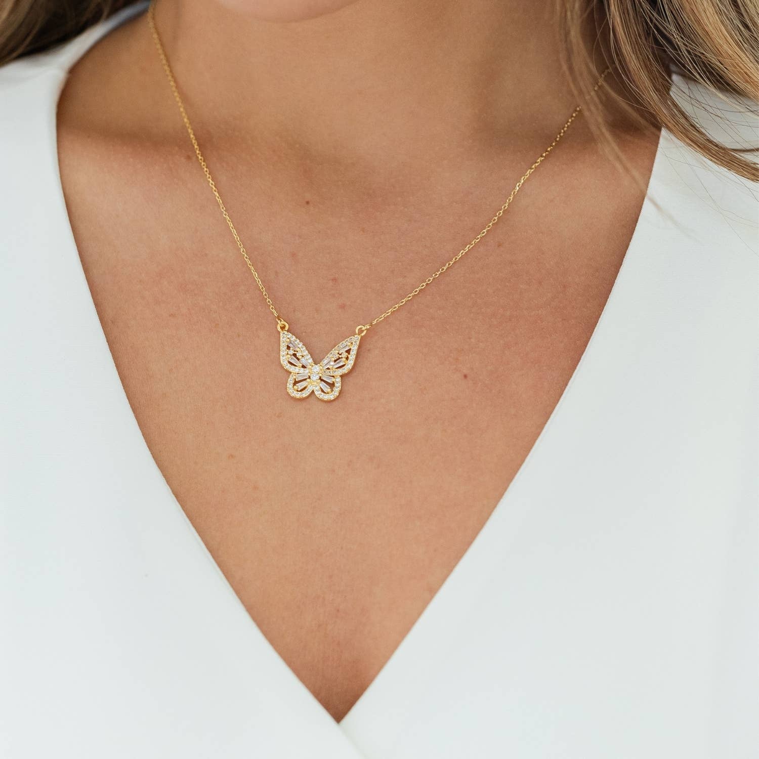 Get ready to flutter with this butterfly pendant, adorned with an assortment of uniquely shaped cubic zirconia! .8 Pendant 16" Necklace 18k Gold Plated Brass Base Cubic Zirconia